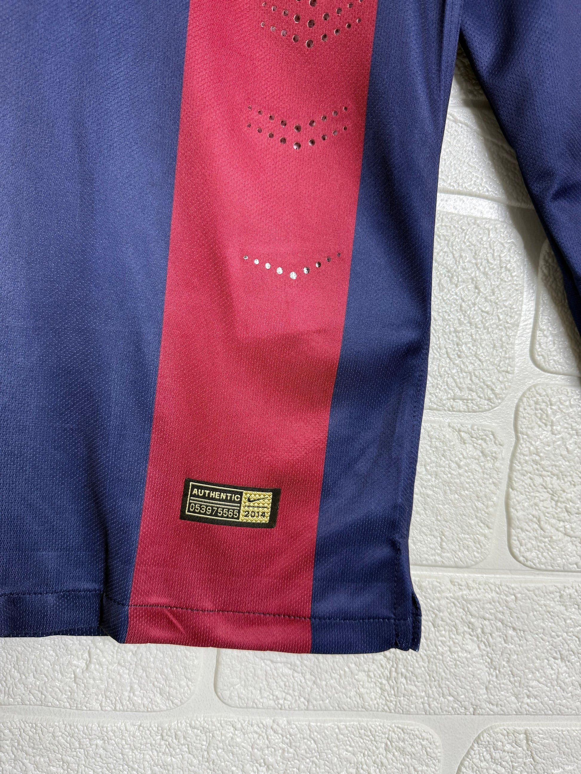 Celebrate one of the greatest seasons in football history with the FC Barcelona 2014/15 Home Jersey. This retro football shirt was worn by a legendary squad led by Lionel Messi, Neymar, and Luis Suárez, as Barça secured a historic treble, winning La Liga, Copa del Rey, and the UEFA Champions League under manager Luis Enrique.