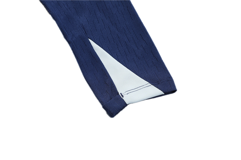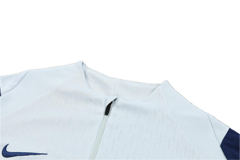 The tracksuit features a light blue upper contrasted with deep navy details, giving it a fresh and contemporary look for the 25/26 season. The jacket includes a high collar, full-zip front, and zip pockets for functionality, while the tapered pants provide flexibility and a slim, athletic silhouette. Both pieces are made from breathable, moisture-wicking stretch fabric to ensure all-day comfort whether you’re on the pitch or off it.