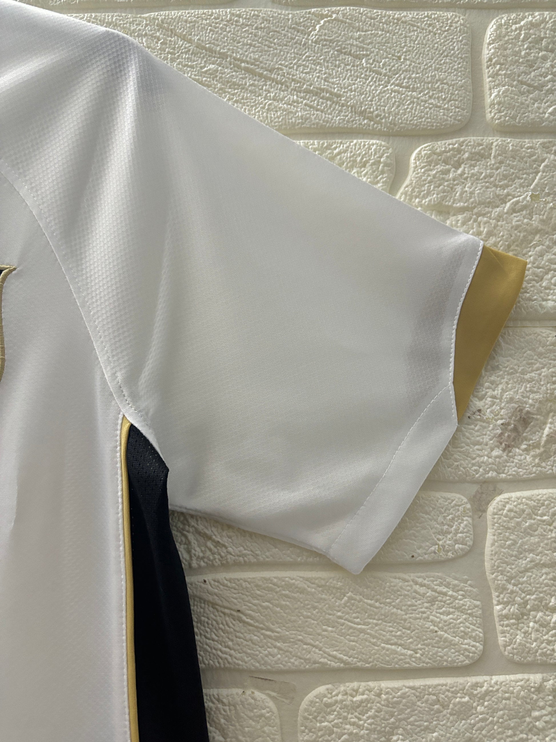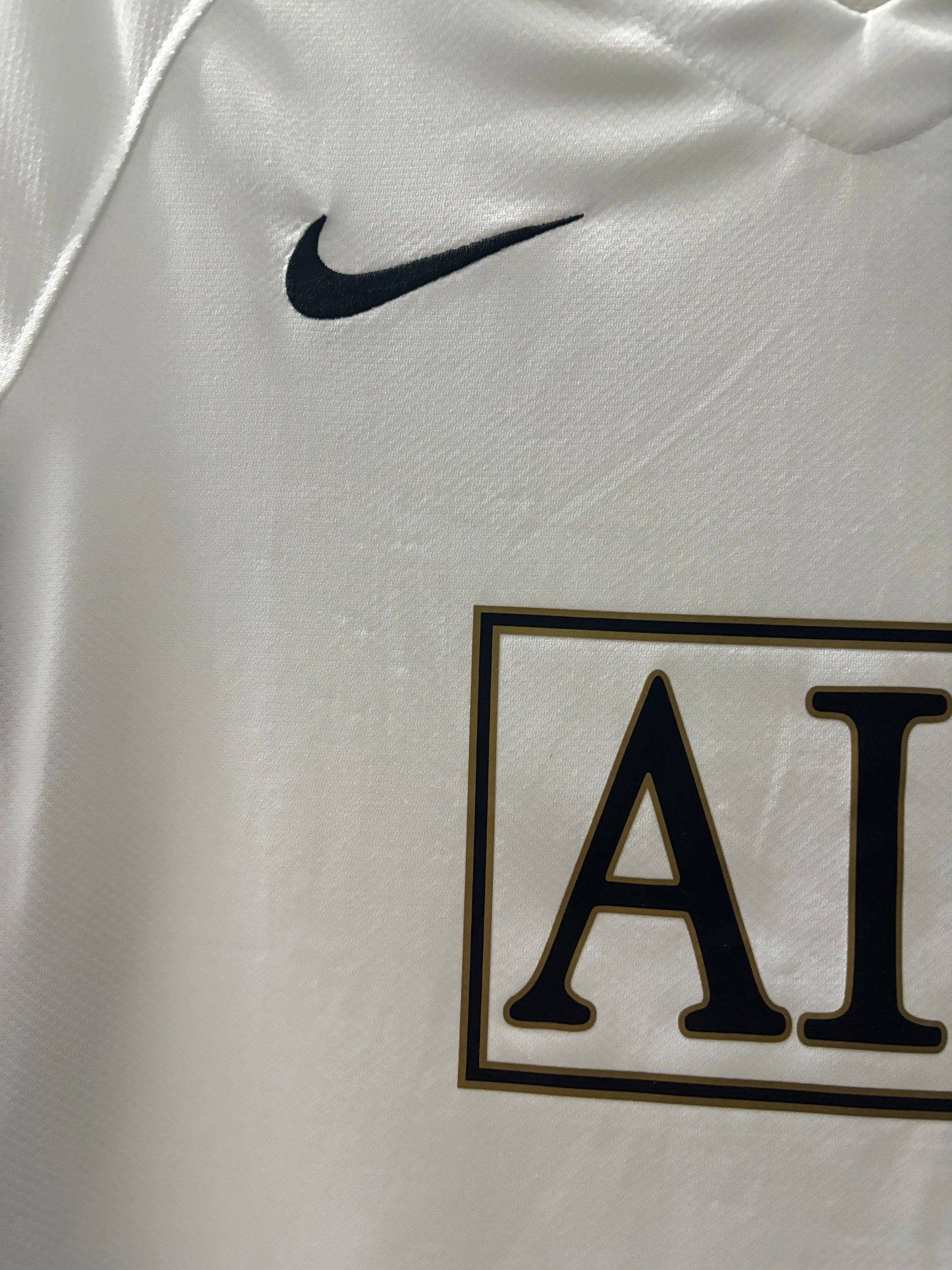 The design features a clean all-white base with red and black trim, a sharp contrast to the club’s traditional home colors. Finished with the AIG sponsor, Nike swoosh, and the United crest of the era, this vintage Manchester United kit remains a fan favorite for its stylish simplicity and connection to Ronaldo’s rise as a global superstar. Perfect for collectors, supporters, and fans of classic soccer jerseys.
