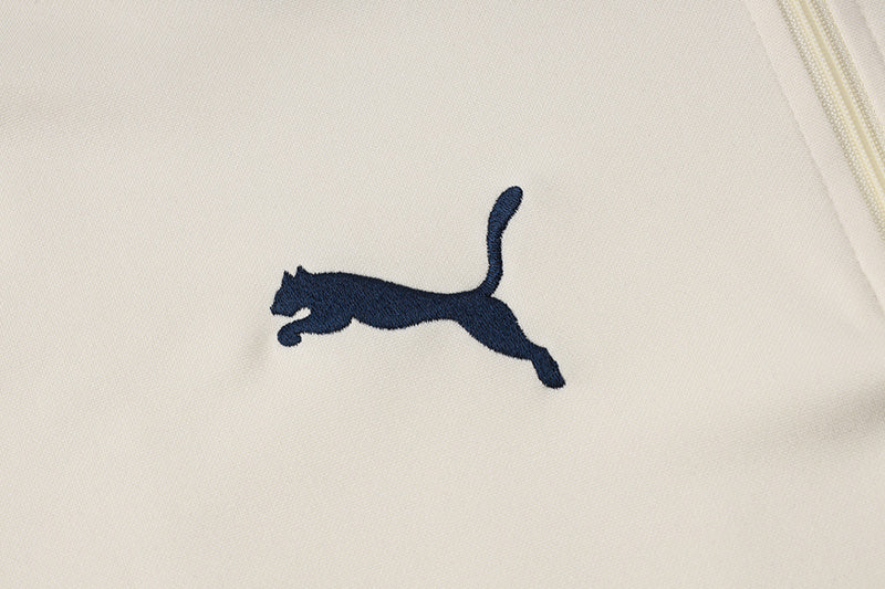 The tracksuit features a cream upper accented with deep navy details, giving it a clean and versatile look that stands out both on and off the pitch. The lightweight jacket includes a high collar, zip pockets, and a flexible fit, while the tapered pants provide freedom of movement with a sharp athletic silhouette. Both pieces are made from breathable, moisture-wicking stretch fabric, ensuring comfort during training, travel, or casual wear.