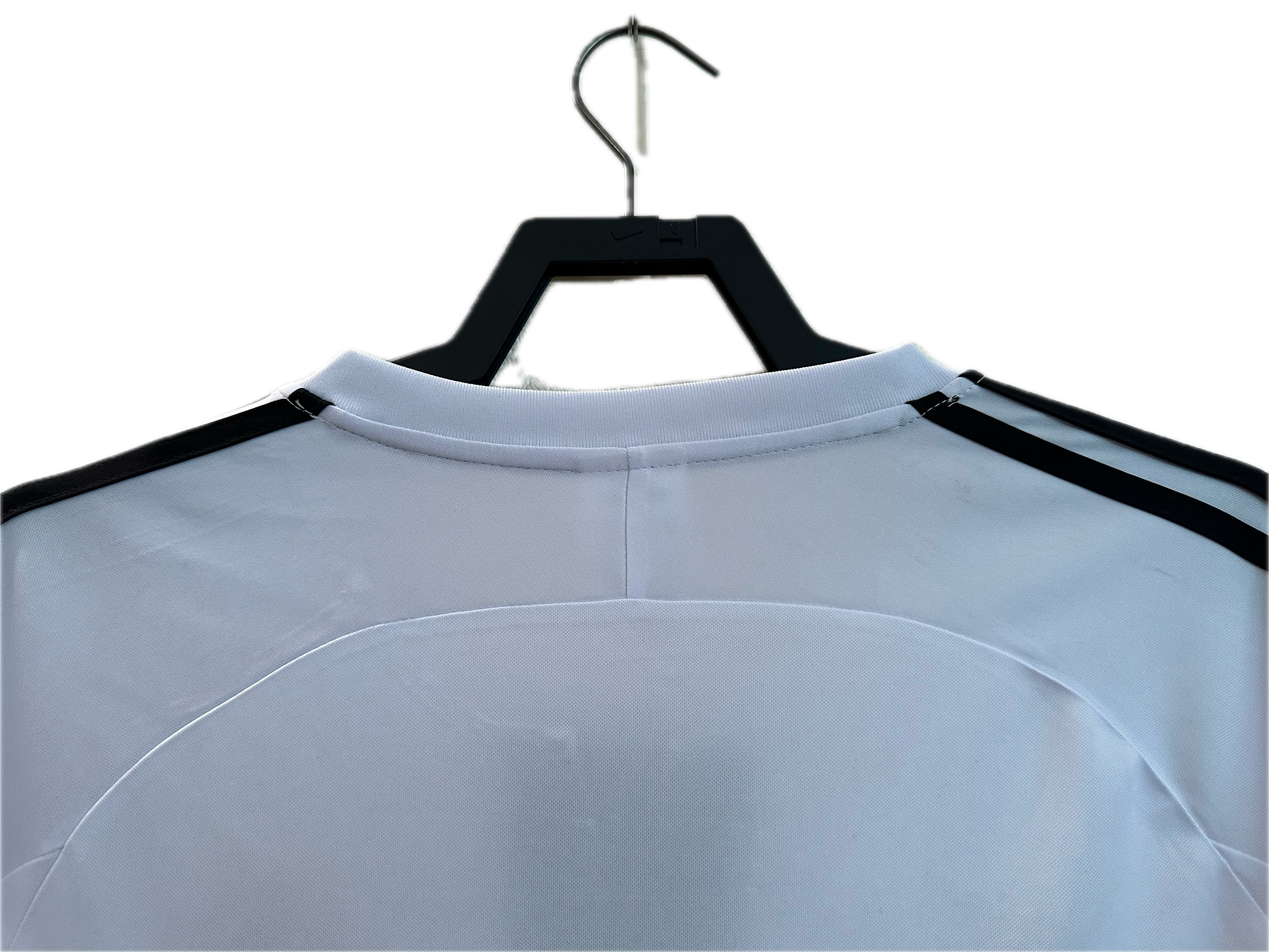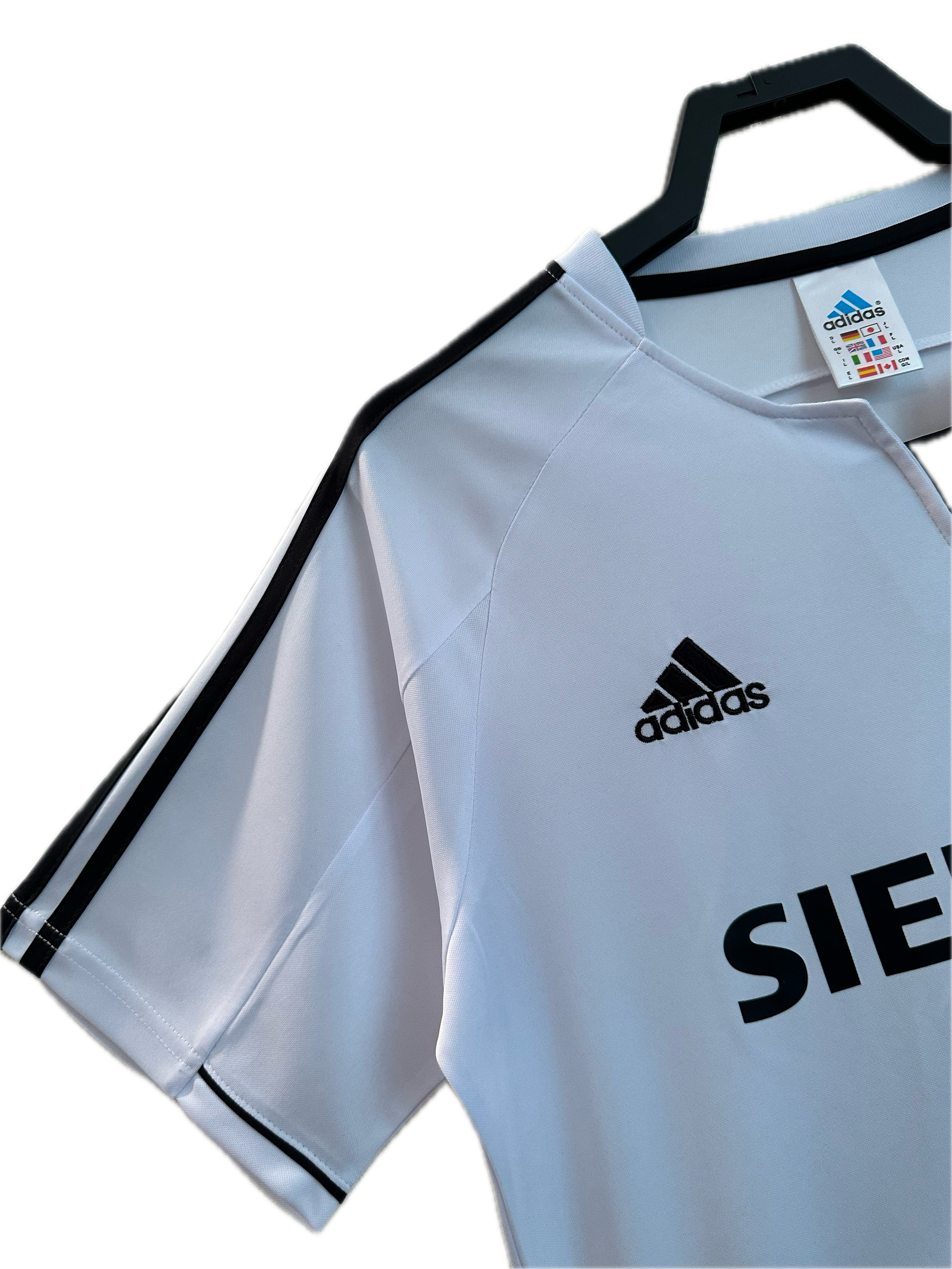 The design features the club’s traditional all-white base, accented with subtle black adidas three-stripes for a sharp and modern look. Complete with the Siemens Mobile sponsor, adidas logo, and the Real Madrid crest of the era, this vintage Madrid kit is a true symbol of the Galácticos era — an age defined by glamour, superstar talent, and unforgettable moments. Perfect for collectors, supporters, and fans of classic soccer jerseys.