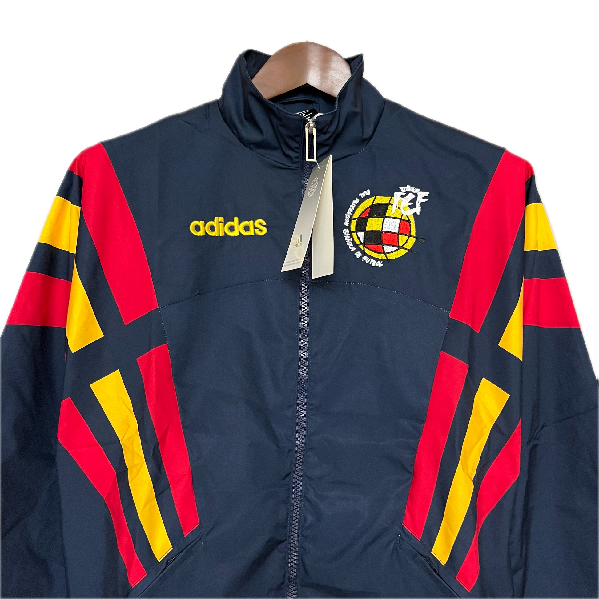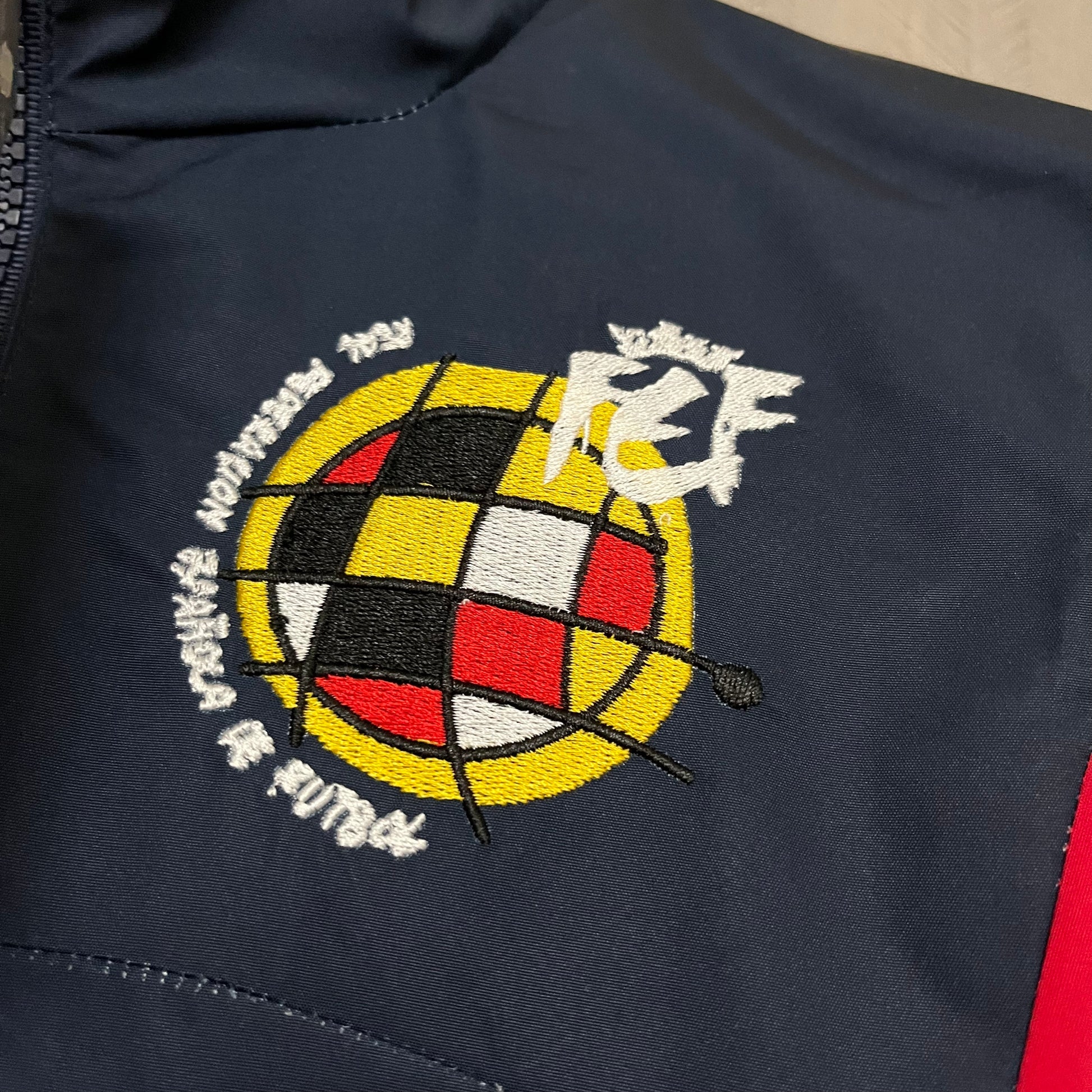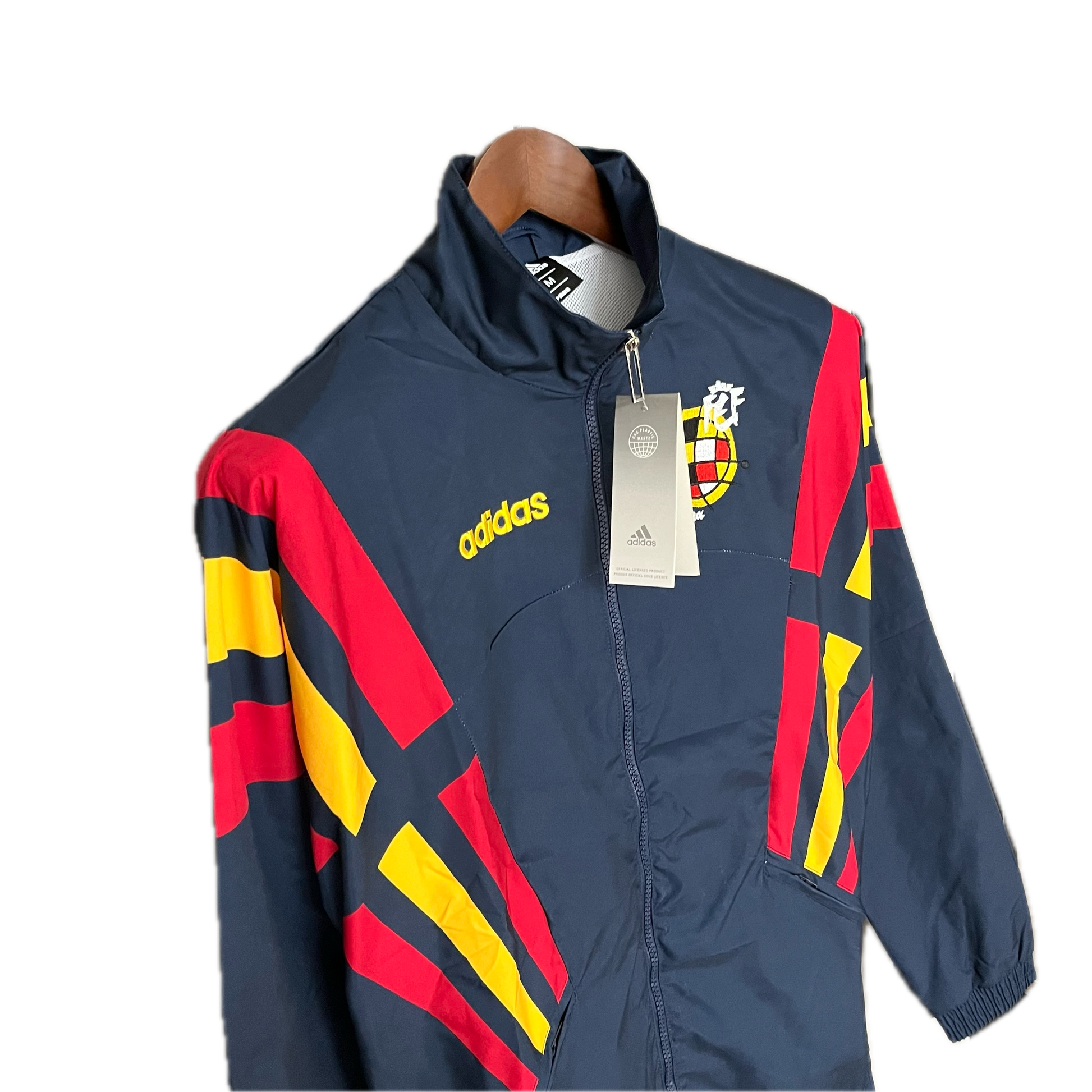 The windbreaker features a deep navy base accented with red and yellow retro-style striping, echoing the classic colors of Spain’s most memorable eras. Made from lightweight, water-resistant, and windproof fabric, it delivers reliable protection while maintaining breathability and ease of movement. The full-zip front, adjustable hood, and elastic cuffs ensure a secure fit, while zip pockets provide everyday practicality.